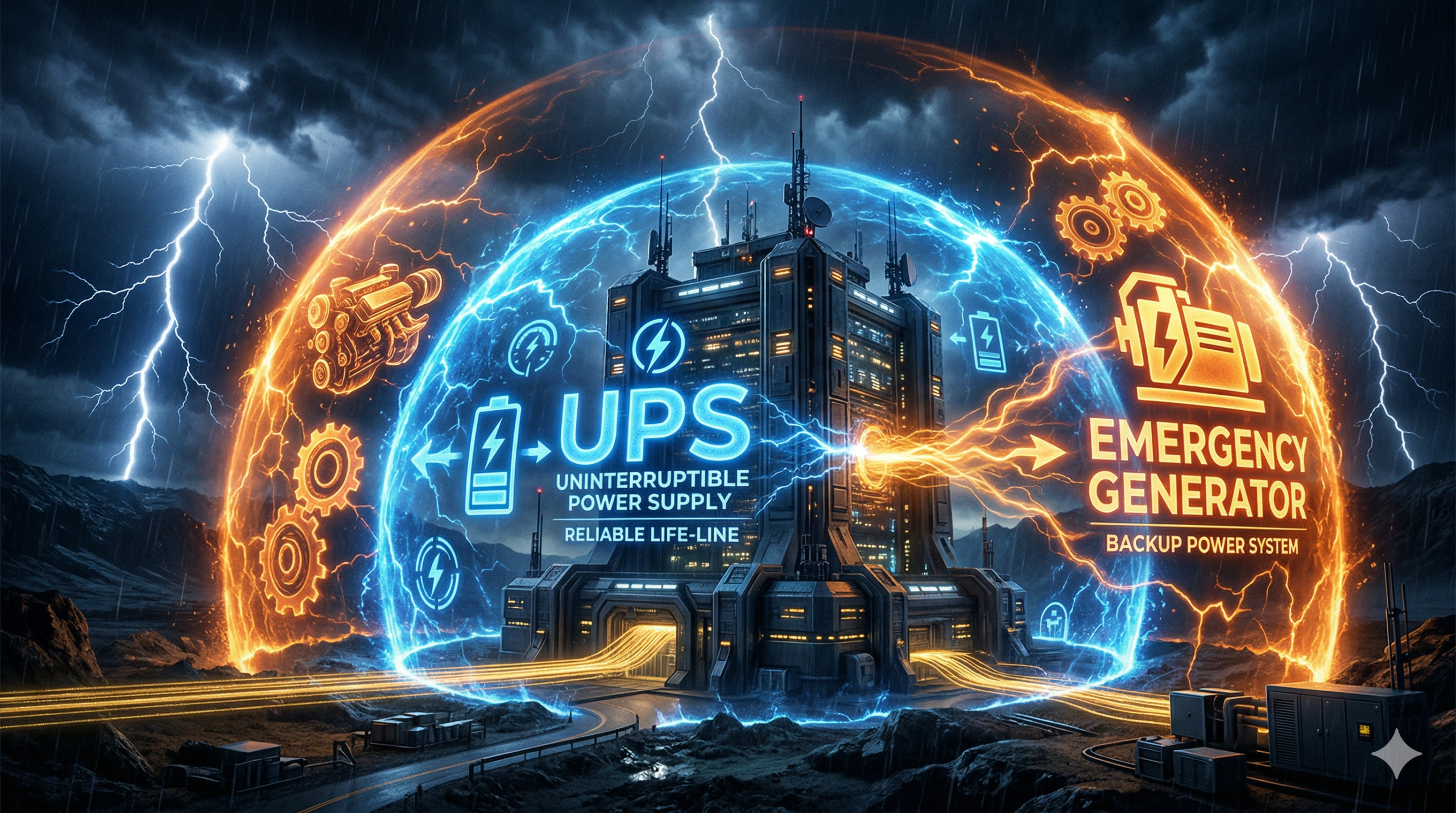 - データセンターの無停電神話は、数分を凌ぐ「UPS」と、数十時間を耐える「非常用発電機」の完璧なリレーによって守られている。
